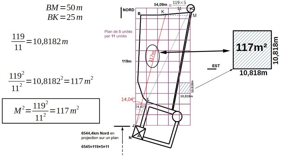 On voit que le nombre 117 représente une superficie dans le "tissu" du plan modulaire carré. On s'aperçoit que le 117 revient aussi comme distance JK=117m.