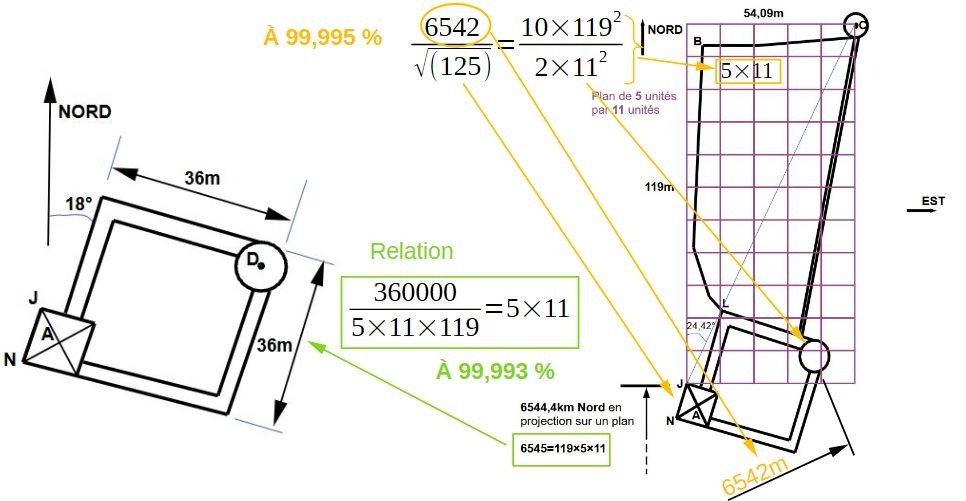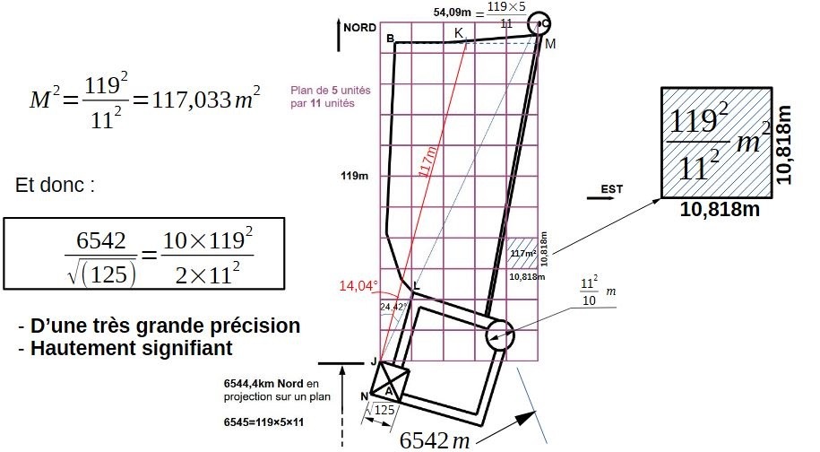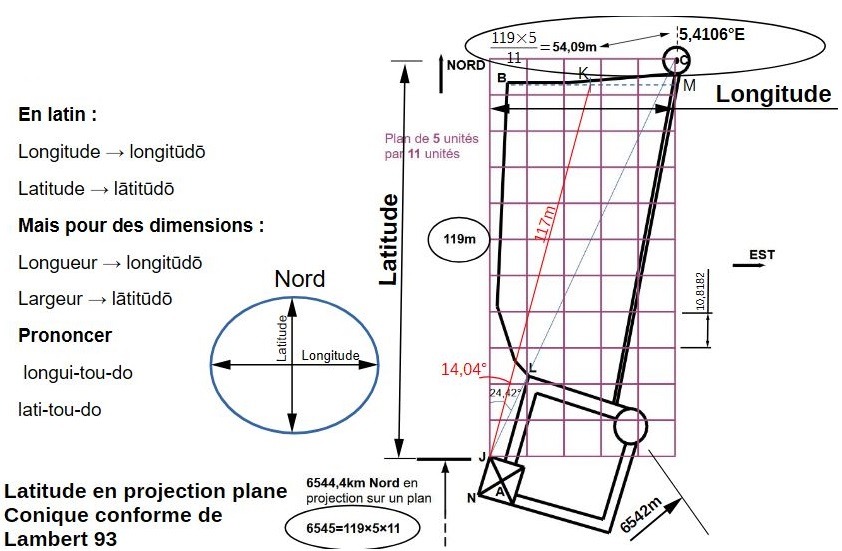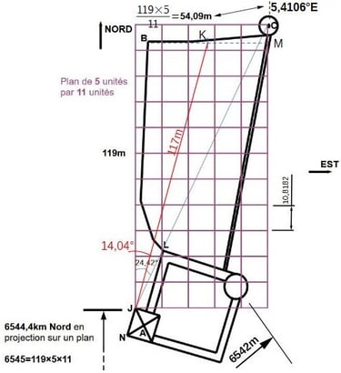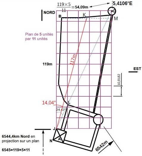 Là c'est plus direct, l'autre côté qui vaut 119×5/11=54,09m offre une suite numérique très très proche de la longitude à cet endroit: 5,41°Est.