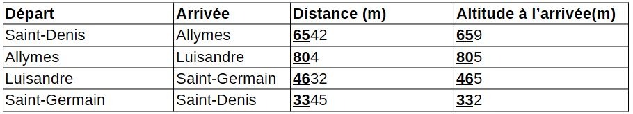Par exemple, la distance Saint-Germain à Saint-Denis, c'est 3345m pour arriver à une altitude de 332 m. Ce qui signifie que les 2 premiers chiffres significatifs (3 et 3) se retrouvent en distance et en altitude. De plus, si on part de Saint-Denis, on en fait une boucle orientée fermée (sens dess aiguilles d'une montre en vue de dessus). Et ceci montre avec certitude une cartographie.