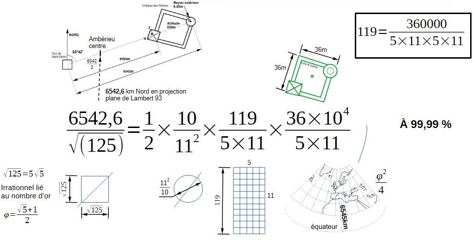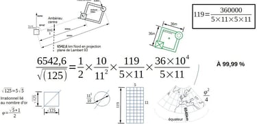 Ce que l'on a découvert, c'est qu'en projection plane conique conforme de Lambert, nous sommes à 6544,4km Nord. Or, 6545=119×5×11.