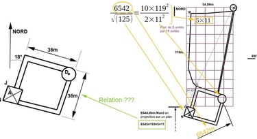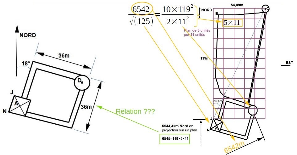 On pourrait dire qu'il nous manque la petite tour ronde au nord, mais aussi surtout l'enceinte principale de 36m en moyenne. Existerait-il une relation permettant de déployer le 36 dans l'équation?