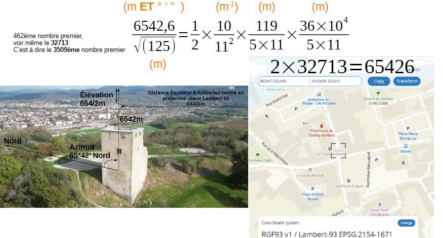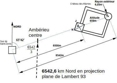 6542 comme latitude en projection plane conique conforme de Lambert, qui se trouve exactement à 6542/3 de la distance Allymes Saint- Denis qui vaut elle aussi 6542. C'est donc le centre ville d'Ambérieu qui est marqué avec ce nombre.