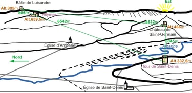 6542 véritable positionnement cartographique du château des Allymes par rapport à la tour de Saint-Denis sur ses 3 composantes principales topographiques.