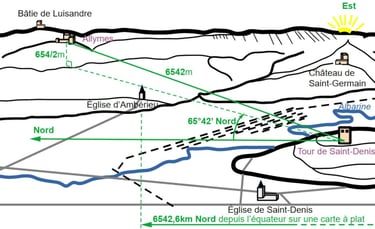 Rien ne remplacera ce visuel comme conclusion. Une équation où le mètre et le degré minute est utilisé comme représentant du nombre en cartographie et architecture. Une véritable équation de conception du château des Allymes. Une véritable équation GPS.