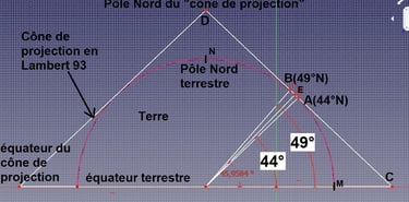 Pour le "Lambert 93" le cône passe par les 44e et 49e // en A et en B . On remarque que plus on va vers le pôle nord terrestre ou l'équateur, plus grande sera la déformation. Le Lambert 93 est donc une projection conique conforme qui est valable pour tous les pays qui se trouvent entre le 41e et le 51e //.