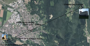 Nous allons voir en faisant un zoom sur la tour de Saint-Denis et le château des Allymes, que la configuration est bien plus précise que cela. Voici donc la configuration surprenante d'Ambérieu-en-Bugey à travers l'orientation du château des Allymes par rapport à la tour de Saint-Denis en Bugey. Cette figure est le pivot de notre démonstration, éloquente en terme de nombres et justifiant directement sans doute possible l'utilisation du mètre, au plus tôt au XIVe siècle (mais cela a pu être fait bien avant avons nous dit).