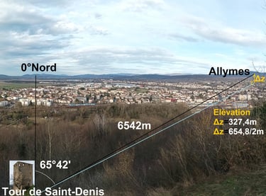 6542 m depuis la tour de Saint-Denis jusqu'au château des Allymes, pour arriver à 659,6m d'altitude....avec redondance du nombre commençant par 65.