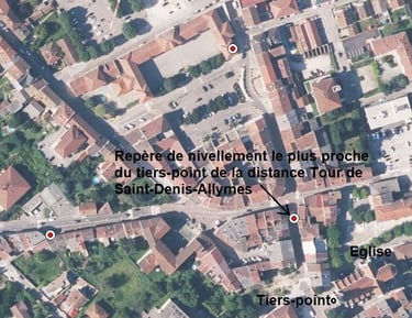 3 repères sont situés au centre ville. Nous avions déjà exprimé le fait, dans un autre article, que l'église est au tiers de la distance. Alors regardons au centre ville. Le repère de nivellement le plus proche de l'église et du tiers-point de la distance Saint-Denis/Allymes est le suivant: