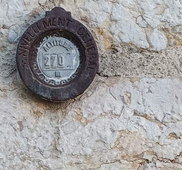 Voici le repère de nivellement qui indique 270m d'altitude. Il est situé à 74cm du sol (mesuré).