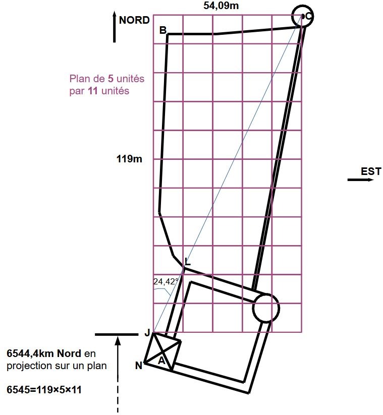 Ici, nous avons un plan modulaire carré très précis positionné justement par rapport au point J, et le point L est par ailleurs aligné avec la diagonale de ce plan modulaire carré, qui positionne le centre de la tour ronde au nord en C.
