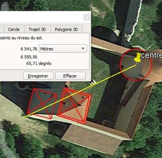 Nous prenons le centre des tours "presque carrées" sur la face au sol. Des erreurs de mesure avec leur implantation sur des dénivelés existent. Toutefois, en gardant cette prise de mesure "centre des tours au sol", les erreurs vont dans le même sens, et donc ne s'ajoutent pas.