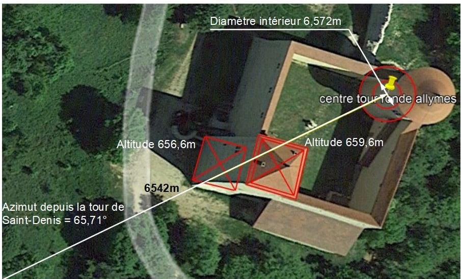 Cependant, depuis la tour de Saint Denis qui est située bien loin, la distance passe par les centres des deux tours du château des Allymes exactement.