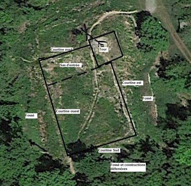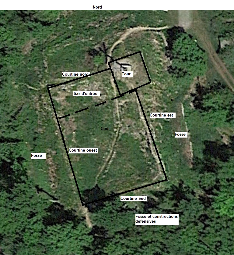 Une orientation est-ouest globale est manifeste, avec à l'est la Grande cour défendu à l'est par deux tours devant lesquelles des fossés sont présents.