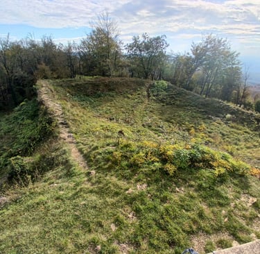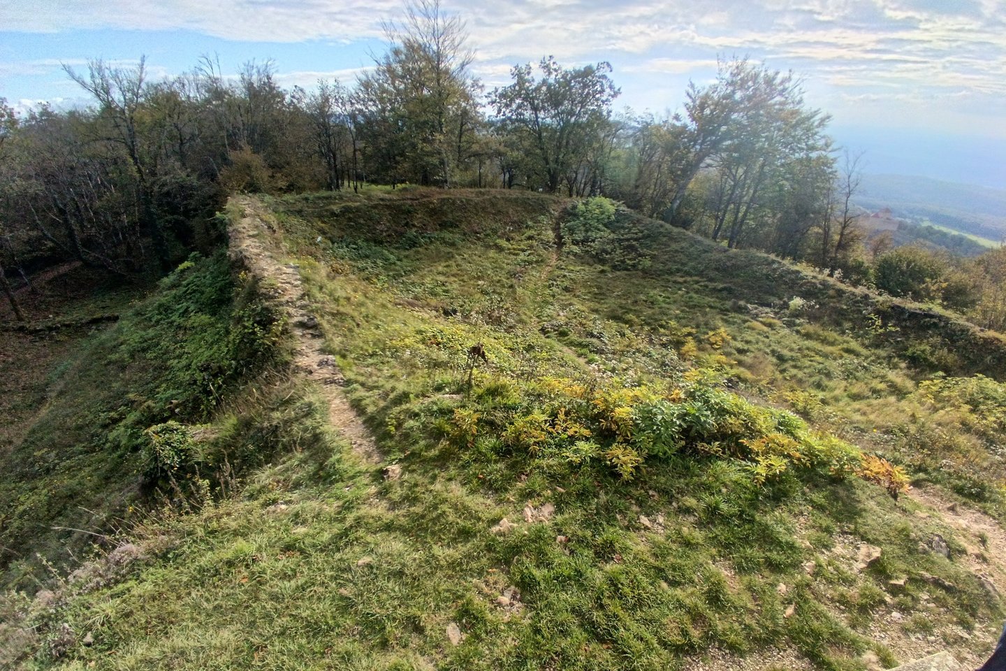 Le promontoire est ce qu'on appelle un mollard: Les constructeurs ont surélevé le terrain pour le préparer par des cailloux (galets) et de la terre. Ainsi le terrassement est à l'altitude de 332m