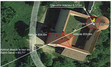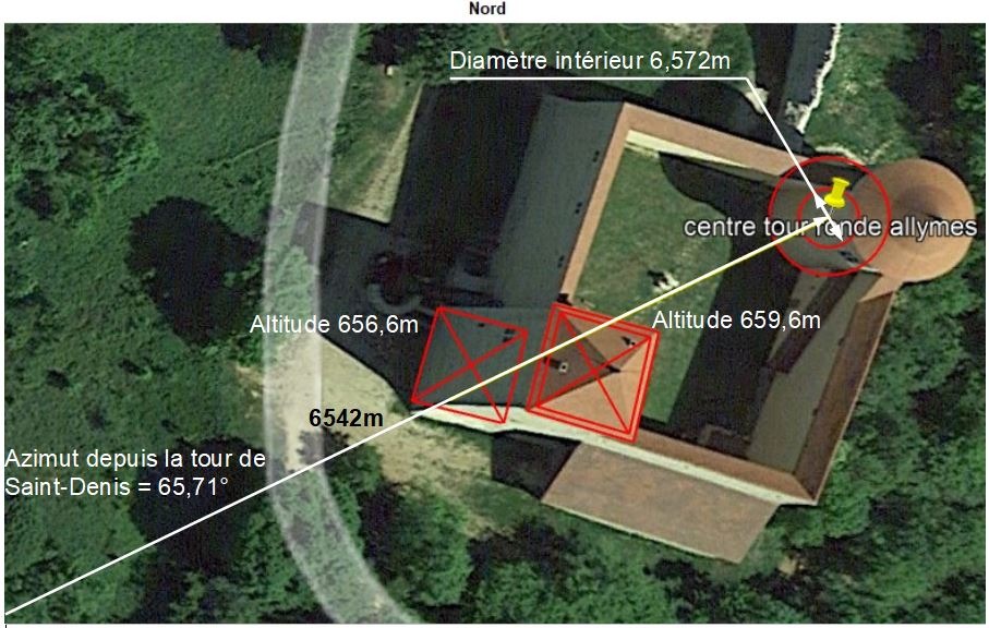 Cependant, depuis la tour de Saint Denis qui est située bien loin, la distance passe par les centres des deux tours du château des Allymes exactement.