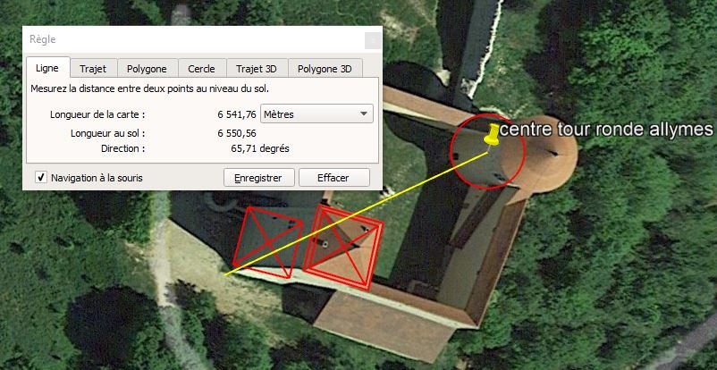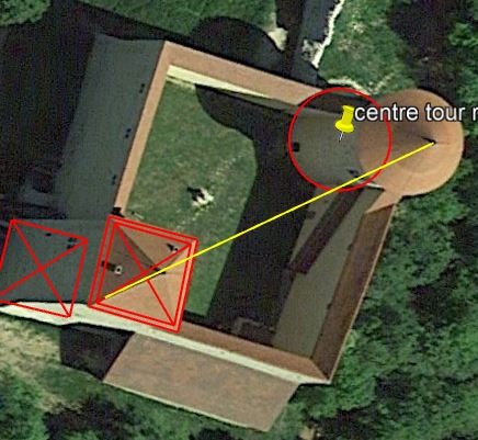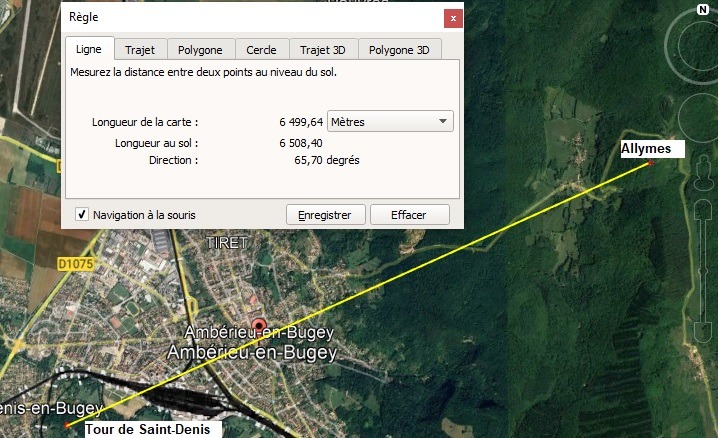 Voici les mesures entre la tour de Saint-Denis et la tour ronde du château des Allymes: