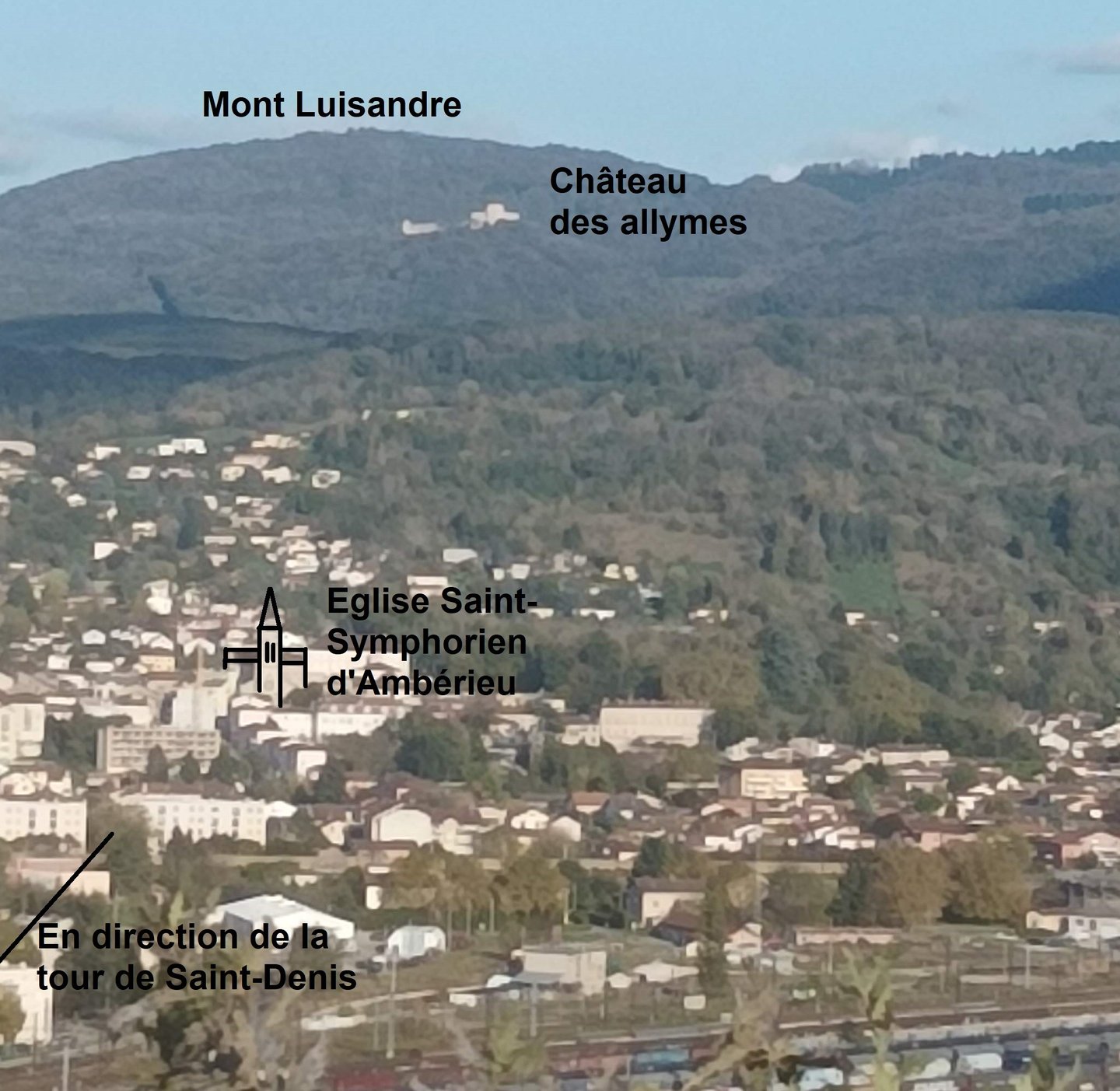 Le mont Luisandre, beaucoup plus haut n'est pas aligné avec tour de Saint-Denis et château des allymes.