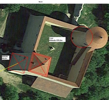 Les courtines du château des allymes semblent nous faire face par l'angle et nous ne voyons pas la tour ronde derrière. Hypothèse 1 d'une diagonale de l'enceinte des Allymes tracée depuis la tour de Saint-Denis envisagée .