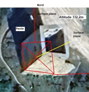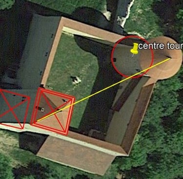 Nous prenons le centre des tours "presque carrées" sur la face au sol. Des erreurs de mesure avec leur implantation sur des dénivelés existent. Toutefois, en gardant cette prise de mesure "centre des tours au sol", les erreurs vont dans le même sens, et donc ne s'ajoutent pas.