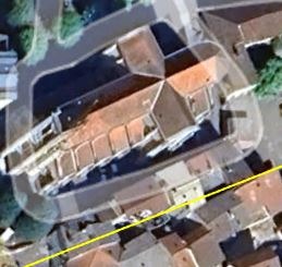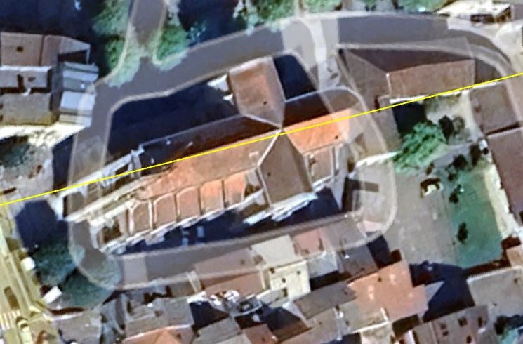 Nous voyons sur l'image que l'église est décalée par rapport à l'axe tour de Saint-Denis / château des Allymes. Le décalage est faible par contre: 23 mètres.